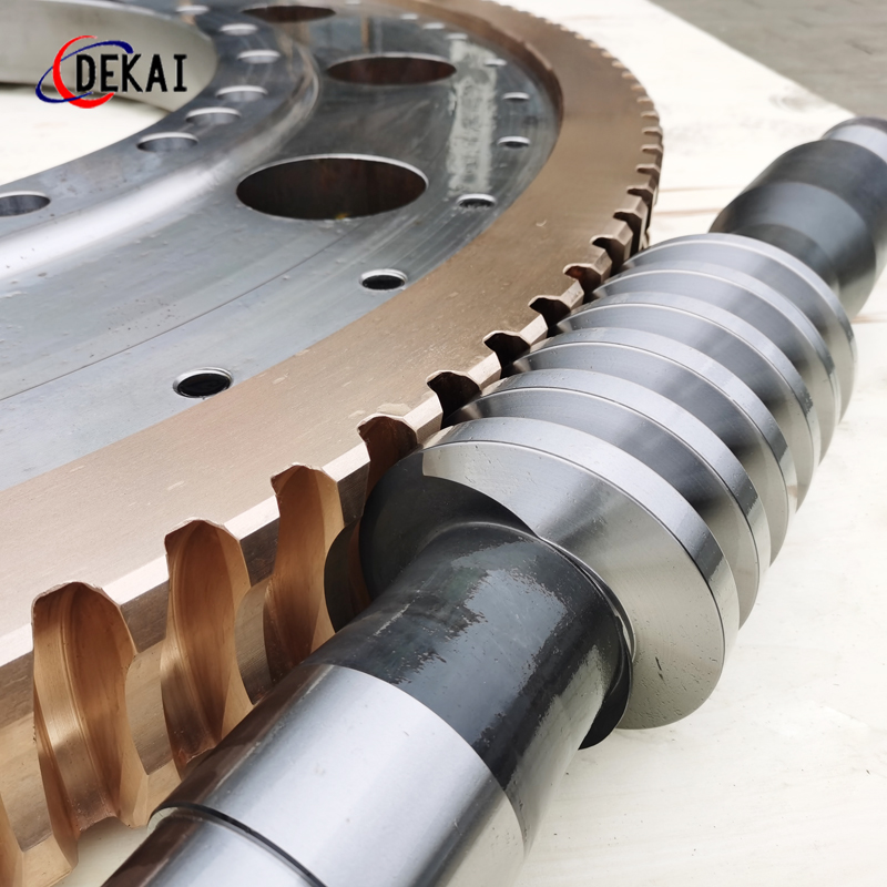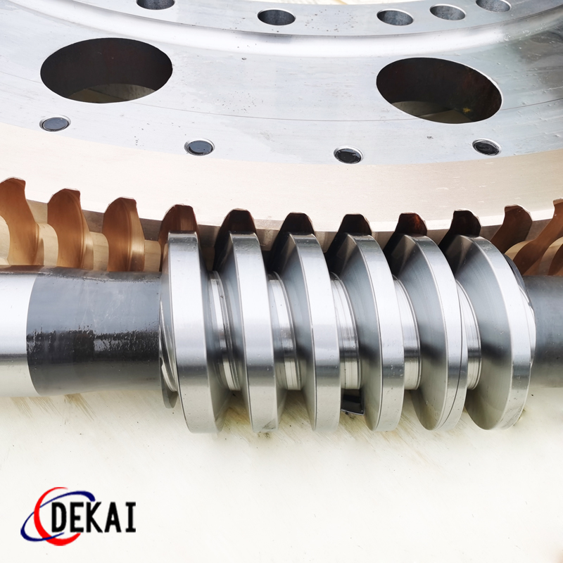 德州德凱減速傳動機械有限公司采用雙蝸桿對消隙原理開發生產的精密蝸輪蝸桿副,主要用于大型機床工作臺的驅動,高精密分割器等無間隙圓周運動精確定位場合。該蝸輪副中心距最大可做到2000mm,單節速比可做到1-365同時不產生回程間隙。