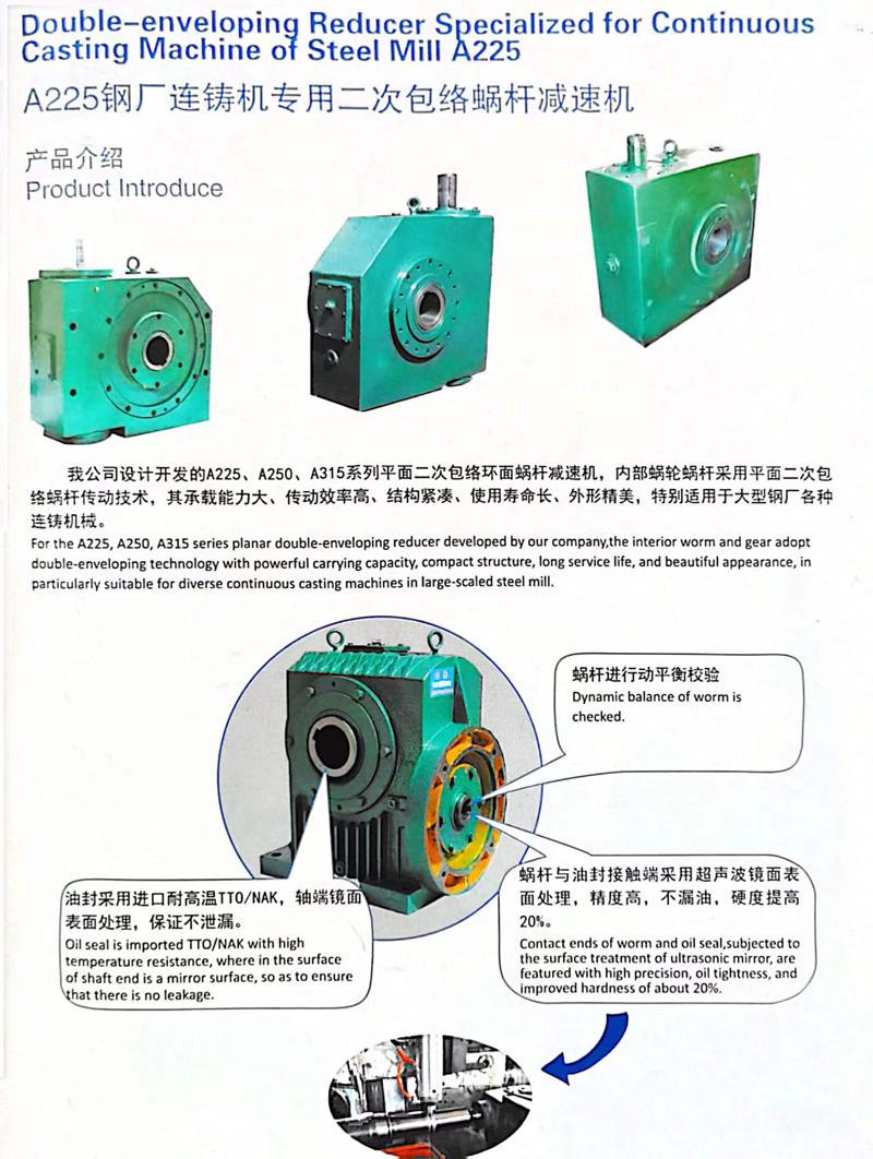 我公司生產的A225、A250、A315系列平面二次包絡環面蝸桿減速機,內部蝸輪蝸桿采用平面二次包絡蝸桿傳動技術,其承載能力大,傳動效率高,結構緊湊、使用壽命長、外形精美、適用于大型鋼廠各種連鑄機械。