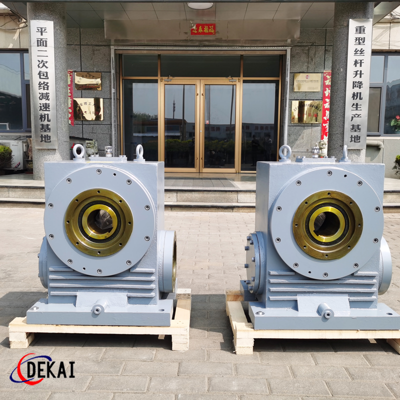 平面二次包絡環面蝸桿傳動于1971年發明的一種新型蝸桿傳動裝置,這種蝸輪副具有以下特點:蝸輪齒面硬度高,表面經滲氮后精確磨削而成,精度高,表面光滑。加工過程與成形原理吻合度高,傳動精度高。蝸桿與蝸輪的嚙合為多齒接觸,每齒為瞬時雙線接觸,齒面接觸區可達70%以上。嚙合面的綜合曲率半徑大。接觸線與相對速度方向夾角大,動壓油膜形成及保持性好。