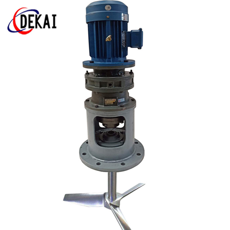 低粘度均相液體混合,由于推進(jìn)式的循環(huán)能力強(qiáng)且消耗動(dòng)力少,所以是合用的,而渦輪式攪拌器因動(dòng)力消耗大,雖有高的剪切能力,但對(duì)于這種混合過(guò)程并無(wú)太大必要,所以大容量液體的混合時(shí)就不合理了。槳式攪拌器因結(jié)構(gòu)簡(jiǎn)單,在小容量液體混合中廣泛應(yīng)用,但是在大容量液體混合時(shí),其循環(huán)能力就不足了。
